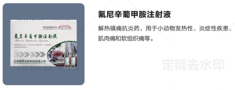 解熱鎮痛抗炎藥,用于小動物發熱性、炎癥性疾患、氟尼親葡甲胺注射液 肌肉痛和軟組織痛等。