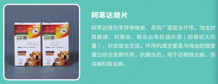 阿苯達唑為苯并咪唑類,具有廣譜驅蟲作用。線蟲對其敏感,對絳蟲、吸蟲也有較強作用(但需較大劑量),對血吸蟲無效。作用機理主要是與線蟲的微管蛋白結合發揮作用??谷湎x藥。用于動物線蟲病、絳蟲病和吸蟲病。